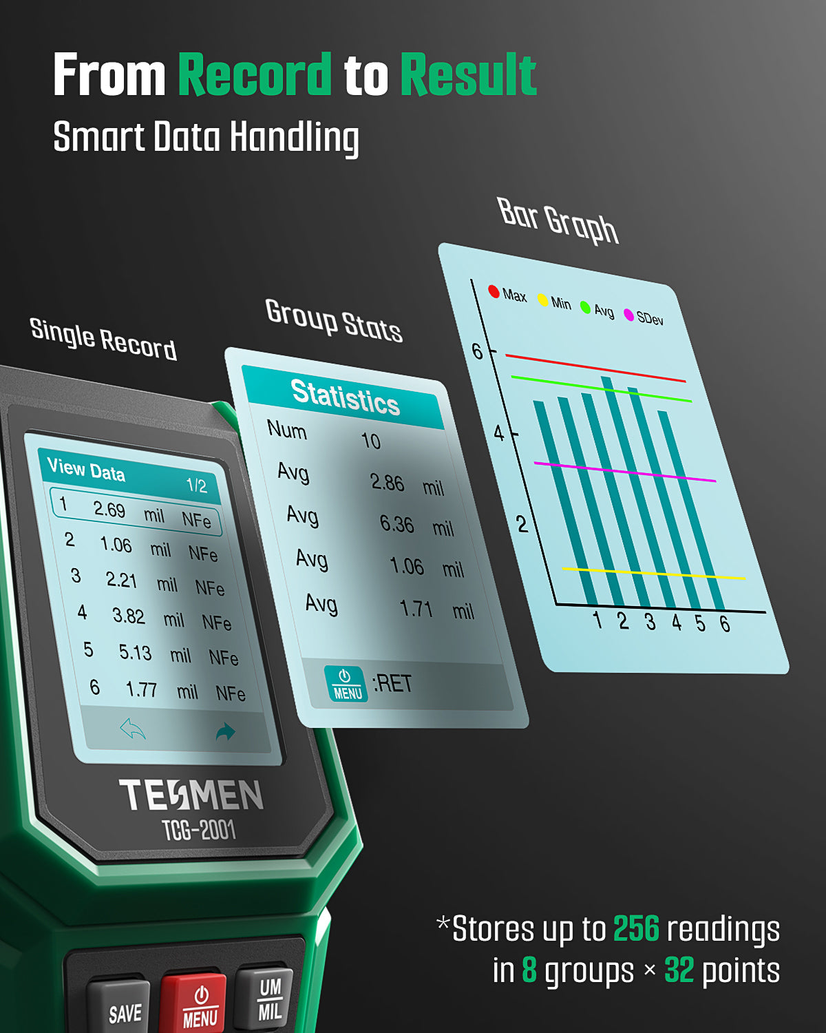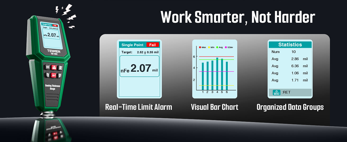 From Record to Insight: Easily log up to 256 readings in 8 groups for organized tracking. The device automatically calculates group statistics (avg, min, max, std dev) and displays results with intuitive bar graphs, letting you review and analyze coating data directly on the screen without extra tools.