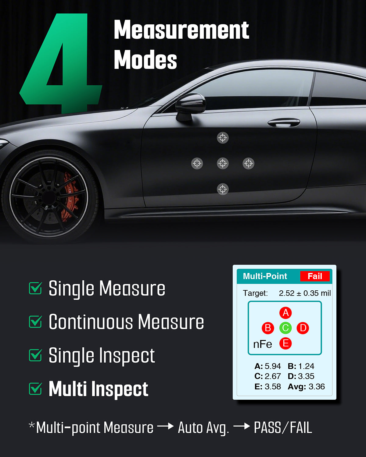 Advanced Multi-Mode Testing: Ideal for checking car paint before buying or inspecting coatings in maintenance work. Offers 4 modes—single, continuous, quick check, and multi-point judgment—plus zero-point and multi-point calibration for accuracy, with an over-limit alert icon for instant on-screen guidance.
