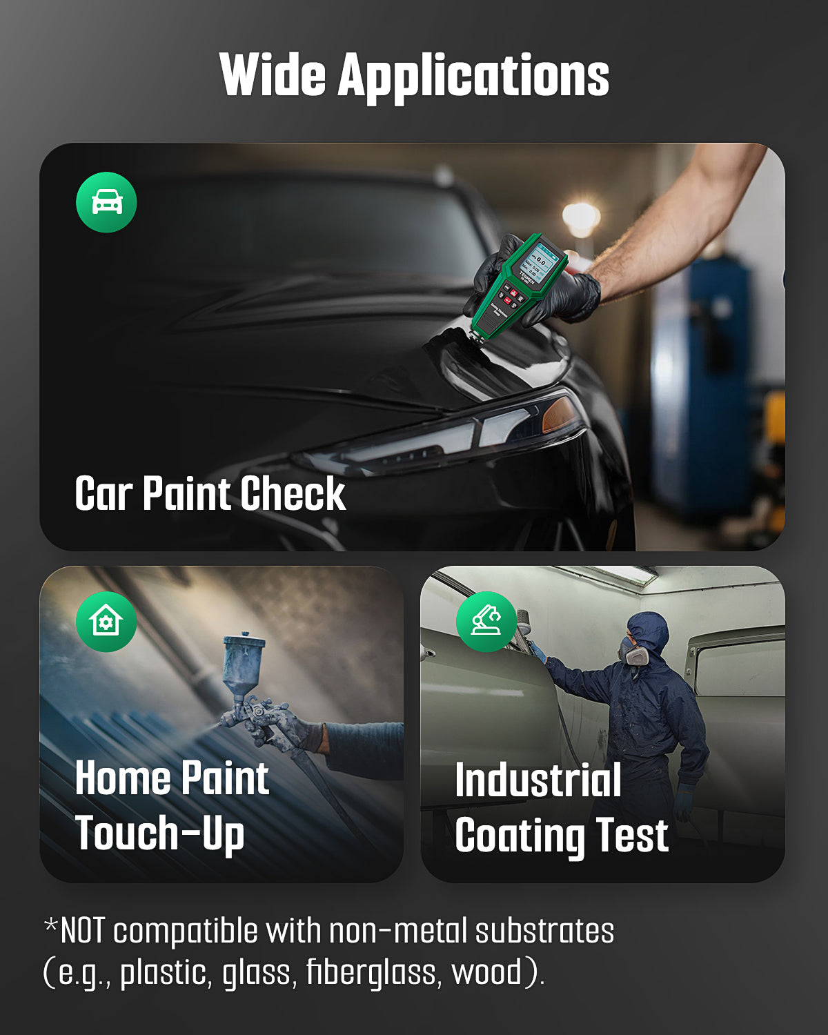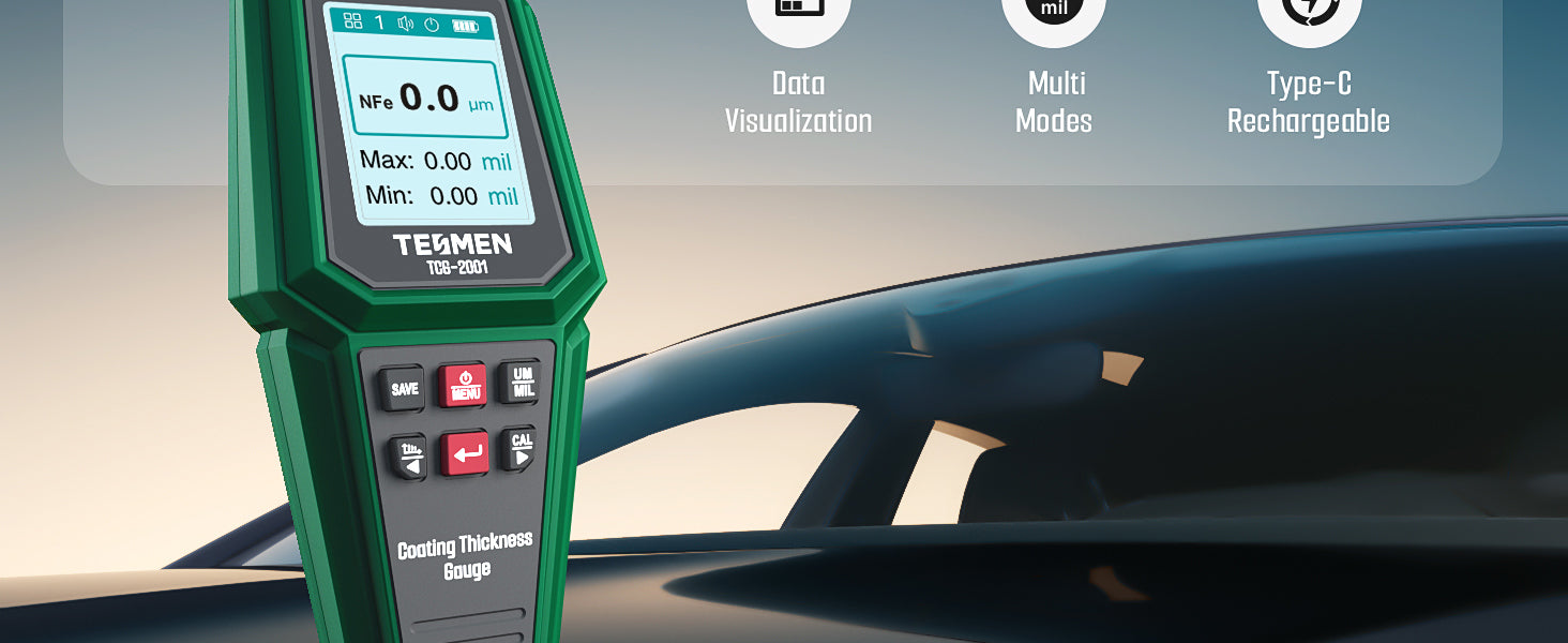 Ideal for Used Car and Automotive Industry: This coating thickness gauge helps used car buyers quickly check paint thickness to avoid costly repairs and save expenses. It’s also widely used in automotive manufacturing, metal processing, home furnishings, and quality inspection, providing reliable, precise measurements across various coating applications.