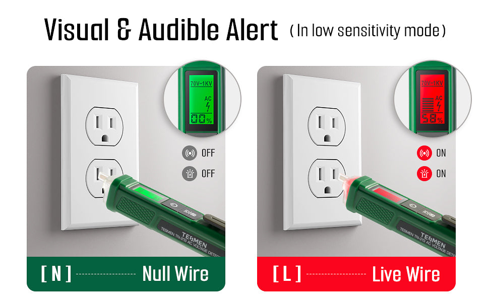 When voltage is detected, the tip emits a red light, the screen turns red, and an alarm sound is triggered. As the detected voltage increases, the red light and alarm sound frequency accelerates.