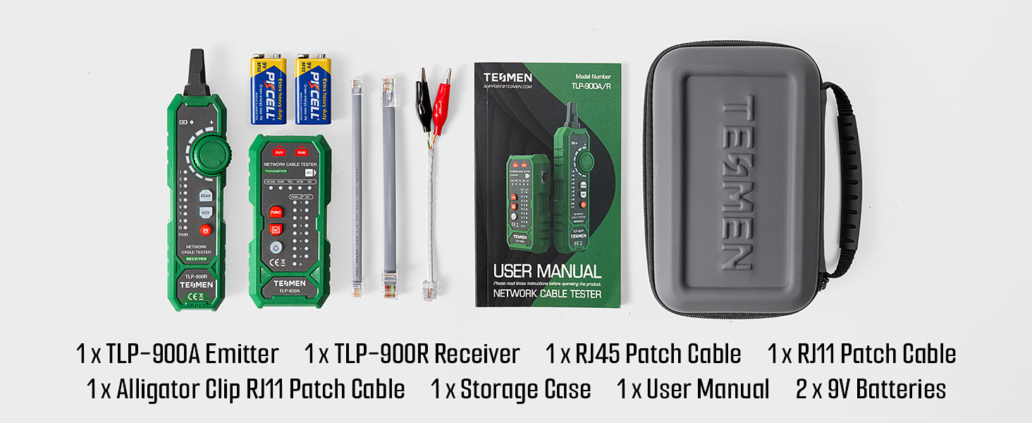 What you will get: 1 transmitter with dual RJ11 RJ45 interface, 1 receiver with RJ45 interface, 1 RJ11 alligator clip adapter cable, 1 RJ45 cable, 1 RJ11 cable, 1 storage box, 1 user manual, 2 * 9V 6F22 batteries.