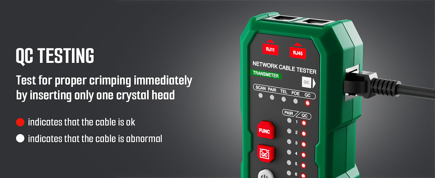 Find line faults:Test line sequence and continuity, and use the LED line sequence indicator to visually check whether the network cable is connected incorrectly, short-circuited, or open-circuited; QC RJ45 crystal head crimping inspection provides thorough cable quality inspection,and quickly feedback on the LED light, which can effectively improve your work efficiency.